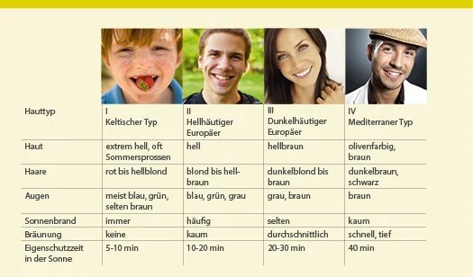 Das Sonnenlicht besteht aus sichtbarer und unsichtbarer Strahlung, die im Verlauf des Tages in unterschiedlich hoher Dosis auf unsere Haut trifft. Je nach Hauttyp (siehe Tabelle) reagiert die Haut unterschiedlich empfindlich auf Sonnenstrahlen. Während z. B. Menschen mit Hauttyp I nach 5–10 Minuten in der prallen Sonne mit Sonnenbrand reagieren, insgesamt jedoch kaum einmal bräunen, können sich Personen mit dem Hauttyp IV ohne Probleme 40 Minuten der Sonne aussetzen und werden dabei nicht rot, sondern braun. Zu beachten ist, dass auch bei bewölkter Wetterlage 60–80 % der maximalen Sonnenstrahlung unsere Haut erreichen und auch Glas (Fenster- oder Autoscheiben) keinen ausreichenden Schutz vor UVA-Licht bietet. Natürlich ist die Intensität der Sonneneinstrahlung an jenen Orten der Erde höher, die der Sonne näher liegen. Je höhere Berge wir erklimmen und je näher wir dem Äquator kommen, desto wichtiger ist ein guter Schutz vor der Sonne.