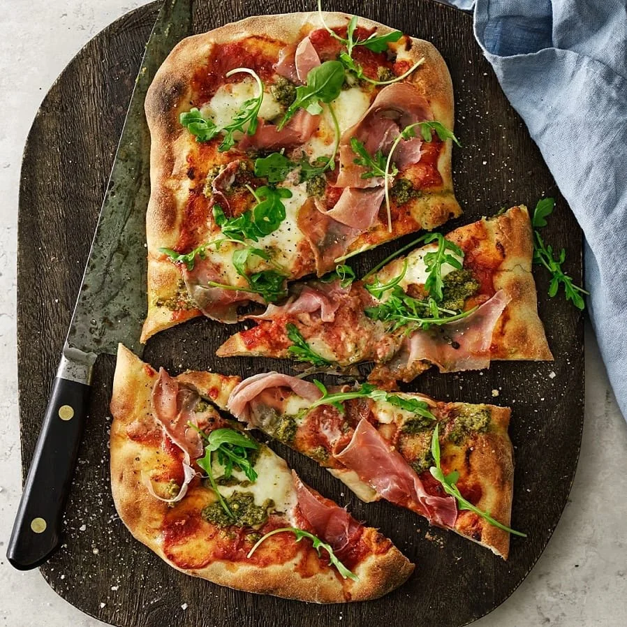 Leichte, bekömmliche Alternative zur klassischen Pizza – aus Dinkel-, Reis- und Sojamehl, mit langer Teigruhe und knusprig-luftigem Ergebnis.